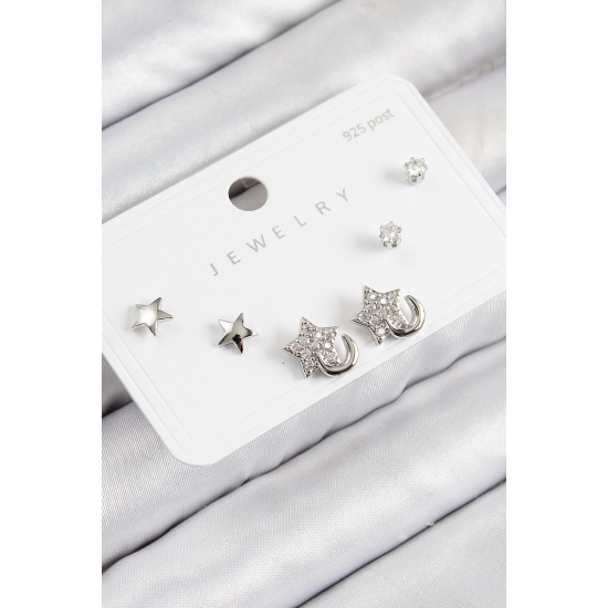 Mey İthalat® Pirinç Zirkon Taşlı Yıldız Model Gümüş Renk 925 Ayar Gümüş Çivi Kadın Küpe Set