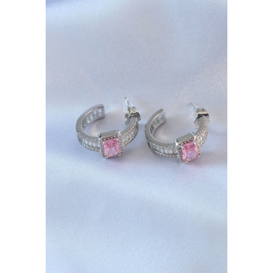 Mey İthalat® VIP Seri Gümüş Renk Yarım Halka Model Zirkon Taşlı Pirinç Kadın Küpe