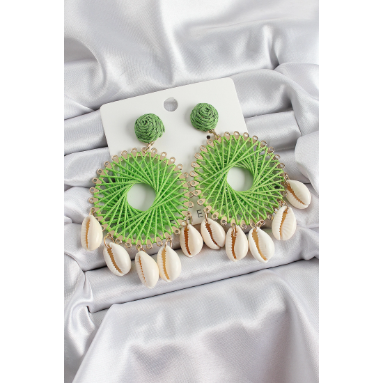 Mey İthalat® Yeşil Hasır Örgü Sarmal Model Sallantılı Deniz Kabuğu Detaylı Gold Renk Kadın Küpe