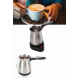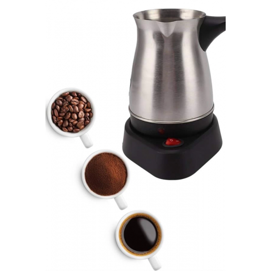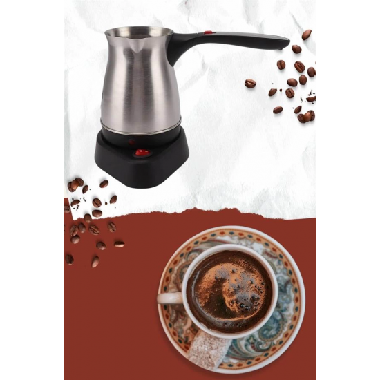 Bu elektrikli cezve, 800 watt gücüyle yüksek performans sağlar ve mükemmel Türk kahvesi deneyimi sunar. 360 ml kapasitesi ile 6 fincana kadar kahve hazırlayabilirsiniz, böylece kalabalık misafirlerinize veya büyük aile yemeklerinde kolayca kahve ikram edebilirsiniz. Gizli rezistans teknolojisi, hızlı ısınma ve güvenli kullanım sağlar, ayrıca temizlik açısından da büyük kolaylık sunar.360 derece dönebilen kablosuz tabanı, rahat bir kullanım sağlar ve her açıdan kolayca hareket etmenize olanak tanır. Paslanmaz çelik gövdesi, hem dayanıklı hem de estetik açıdan şık bir görünüm sunar. Kolayca temizlenebilen tasarımı, hijyenik bir kullanım imkanı tanır ve her seferinde taze kahve hazırlamanızı sağlar.Cezvenin üzerinde bulunan kırmızı güç düğmesi ile açma ve kapama işlemleri son derece basittir. Isınmayan ergonomik kulpu ise güvenli ve rahat bir tutuş sağlar. Paslanmaz çelik yapısı, uzun ömürlü kullanım ve şık bir tasarım sunarak mutfağınıza zarif bir dokunuş katar.Bu elektrikli cezve, Türk kahvesi sevenler için mükemmel bir seçimdir. Hem işlevsel hem de estetik özellikleriyle kahve hazırlama deneyiminizi daha pratik ve keyifli hale getirir. 6 fincana kadar kapasitesiyle geniş aileler ve misafirler için ideal bir yardımcıdır.