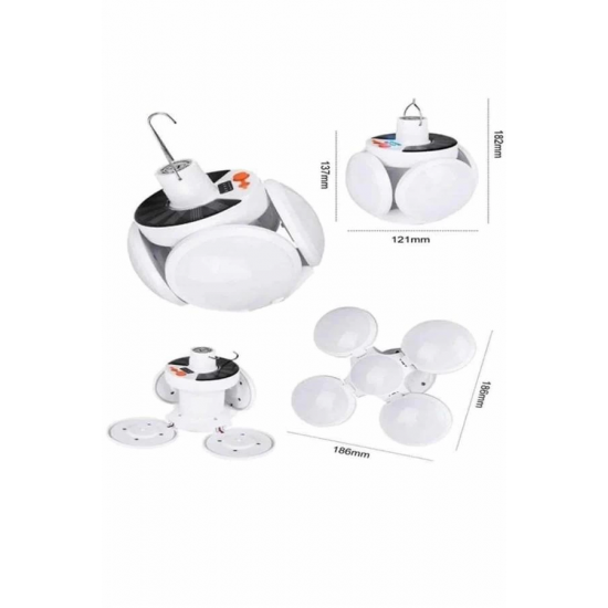 Solar Güneş Enerjisi ve USB Şarjlı 5 Kanatlı Taşınabilir Lamba – Çok Fonksiyonlu, Su Geçirmez ve Enerji Verimli AydınlatmaAçık hava etkinliklerinde, kamp gezilerinde veya acil durumlarda kullanabileceğiniz mükemmel bir taşınabilir aydınlatma çözümü arıyorsanız, Solar Güneş Enerjisi ve USB Şarjlı 5 Kanatlı Lamba tam size göre! Bu pratik lamba, güneş enerjisi ile şarj olabileceği gibi, USB ile de kolayca şarj edilebilir ve her koşulda güvenilir bir ışık kaynağı sunar.5 kanatlı tasarımı, ışığın yayılmasını etkili bir şekilde sağlayarak geniş alanları aydınlatmanızı mümkün kılar. Katlanabilir yapısı sayesinde ışık açısını ihtiyacınıza göre ayarlayabilirsiniz. Böylece karanlık alanlarda daha geniş bir alanı rahatlıkla aydınlatabilirsiniz.Güneş paneli ile doğa dostu bir enerji kaynağı kullanabileceğiniz gibi, USB ile şarj etme seçeneği de sunan bu lamba, her ortamda pratik kullanım imkânı sağlar. Solar şarj ile çevreye duyarlı bir şekilde enerji elde ederken, USB şarj özelliği sayesinde hızlı ve pratik bir şekilde enerji depolayabilirsiniz.Su geçirmez IP65 özelliği, dış mekanlarda kullanım için ekstra dayanıklılık sunar. Yağmurda veya nemli koşullarda bile güvenle kullanılabilir. Ürün, 45 LED ışık kaynağı ile karanlık ortamlarda yüksek kaliteli ışık sağlar ve 6500K renk sıcaklığı ile net ve parlak bir aydınlatma sunar.Teknik Özellikler:Güneş Paneli: 5.5V polikristal silikon güneş paneliPil: 18650 lityum pil, 2400mAhIşık Kaynağı: 45 LEDÇalışma Süresi: 6-8 saatŞarj Süresi: Solar şarj için 8 saat / USB şarj ile 6 saatŞarj Yöntemi: Solar şarj (DC 3.5V) / USB şarj (voltaj 4.5V)Su Geçirmezlik: IP65Renk Sıcaklığı: 6500KÜrün Boyutu: 14 cm * 11.5 cmPaket İçeriği:1 Adet 5 Kanatlı Solar Pratik LambaAcil durumlarda, kamp gezilerinde veya açık hava etkinliklerinde güvenle kullanabileceğiniz bu solar lamba, size her zaman güvenli, verimli ve çevre dostu bir ışık kaynağı sunar. Hem güneş enerjisiyle hem de USB ile şarj edilebilen bu pratik aydınlatma aracı, her koşulda size yardımcı olur.