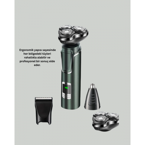 Şık, ergonomik ve fonksiyonel tasarımı ile öne çıkan bu çok yönlü tıraş makinesi; saç, sakal ve burun tüyü temizliğini tek cihazla mümkün kılar. Farklı başlık seçenekleriyle her bölgeye özel bakım sunan cihaz, özellikle yüz bakımını özenle yapan kullanıcılar için tasarlandı.Burun ve kulak temizleme başlığı, hassas bölgelerde güvenli temizlik imkânı sunar. Ucundaki özel kesim bıçağı, tüyleri acıtmadan ve tahriş etmeden alır. Bu özellik, kişisel bakımın en zorlu kısımlarından biri olan burun ve kulak bölgelerini kolaylaştırır.Gelişmiş motor teknolojisi sayesinde hızlı ve güçlü tıraş sağlarken, kuru kullanım özelliği ile su veya köpük gibi yardımcı ürünlere ihtiyaç duymadan işlem yapılabilir. Özellikle yoğun tempoda olan kullanıcılar için hızlı çözüm sunar.USB üzerinden şarj edilebilen cihaz, birkaç saatlik şarjla uzun süreli kablosuz kullanım sunar. Bu özellik seyahat eden, dışarıda zaman geçiren kullanıcılar için ekstra konfor sağlar. İhtiyacınız olan her yerde kişisel bakım rutininizi aksatmadan sürdürebilirsiniz.Kompakt tasarımı ve hafif yapısıyla taşınabilirliği kolaydır. Çantanıza atabilir, iş yerinde ya da seyahatte bile rahatça kullanabilirsiniz. Tüm başlıklar yıkanabilir yapıdadır ve cihazın hijyenik kalmasını sağlar.Estetik, fonksiyonellik ve pratikliği bir araya getiren bu tıraş makinesi, bakımına önem veren erkeklerin en iyi yardımcısı olacak.