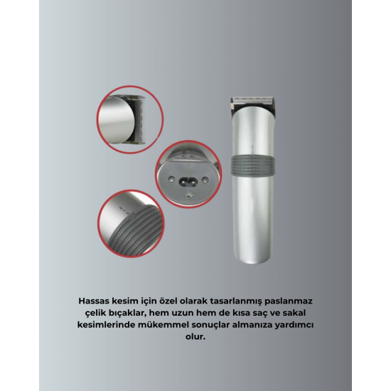 Bu tıraş makinesi, kablosuz çalışma özelliği sayesinde size her ortamda özgürce kullanım imkânı sunar. Priz aramadan, kordonla uğraşmadan ya da hareket kısıtlaması yaşamadan tıraş olabilmek, özellikle günümüz hızlı yaşam temposunda büyük kolaylık sağlar. Cihaz, yüksek kapasiteli dahili bataryası sayesinde uzun süreli kullanım sunar ve kısa sürede şarj olur.Tam dolu şarjla birden fazla kez tıraş olabilirsiniz. Bu özellik, seyahat edenler veya günlük rutinde hızlı çözümlere ihtiyaç duyanlar için oldukça avantajlıdır. Şarj adaptörü kutu içeriğine dahil olduğu için ekstra aksesuar satın almanıza gerek kalmaz. Ayrıca cihaz, şarj esnasında da güvenli kullanım sağlar.Kablosuz kullanım ergonomik tasarımla birleştiğinde, kullanıcı deneyimi maksimum seviyeye çıkar. Cihaz, elinize rahatça oturacak şekilde tasarlanmıştır ve uzun süre kullanımda bile yorgunluk hissi yaratmaz. Tutuş kolaylığı, hassas bölgelerde kontrollü kesim yapmayı da kolaylaştırır.Güçlü motoru sayesinde batarya ile çalışırken bile performans kaybı yaşanmaz. Saç veya sakal tipi fark etmeksizin cihaz etkili bir kesim yapar. Kalın telli saçlarda veya yoğun sakallarda bile makine zorlanmaz. Bu, yalnızca ev kullanıcıları için değil; kuaför ve berber gibi profesyoneller için de önemli bir özelliktir.Makine ayrıca taşımaya uygun boyutlarda üretilmiştir. Kompakt yapısı sayesinde seyahat çantalarına kolayca sığar. Böylece iş seyahatlerinizde, tatillerde ya da hafta sonu kaçamaklarında tıraş rutininizi aksatmak zorunda kalmazsınız.Sonuç olarak bu şarjlı ve kablosuz tıraş makinesi, hareket özgürlüğü sunan yapısıyla klasik makinelerin sınırlamalarını ortadan kaldırır. Hem işlevsel hem pratik bir çözüm arayanlar için ideal bir modeldir. İster evde ister dışarıda olun, her yerde kesintisiz ve kaliteli bir tıraş deneyimi için güvenle tercih edebilirsiniz.