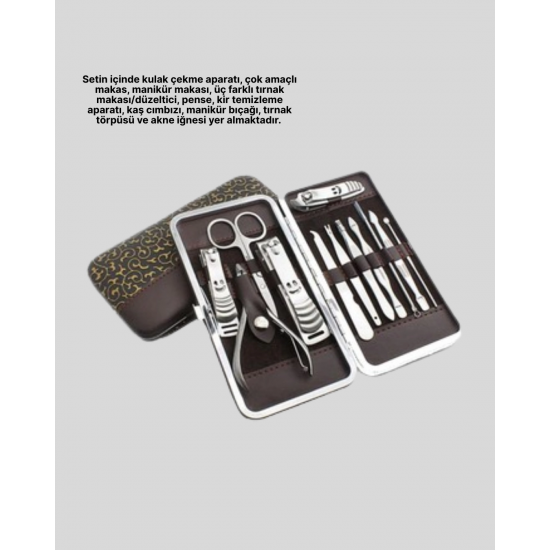 Hem kadınlar hem de erkekler için uygun olan bu özel deri çantalı bakım seti, kapsamlı içeriğiyle kişisel bakımınızı kolaylaştırır. Paslanmaz çelikten üretilmiş parçaları dayanıklı, keskin ve hijyeniktir. İçeriğinde tırnak makasları, pense, törpü, cımbız, kulak aparatı, manikür bıçağı, akne iğnesi ve çok amaçlı makas yer alır. Şık deri çantası sayesinde tüm parçalar düzenli bir şekilde saklanabilir. Kompakt boyutu ile çantanızda taşıyabilir, seyahatlerde rahatlıkla kullanabilirsiniz. Günlük kullanım için ideal, aynı zamanda hediye olarak da şık bir alternatiftir.