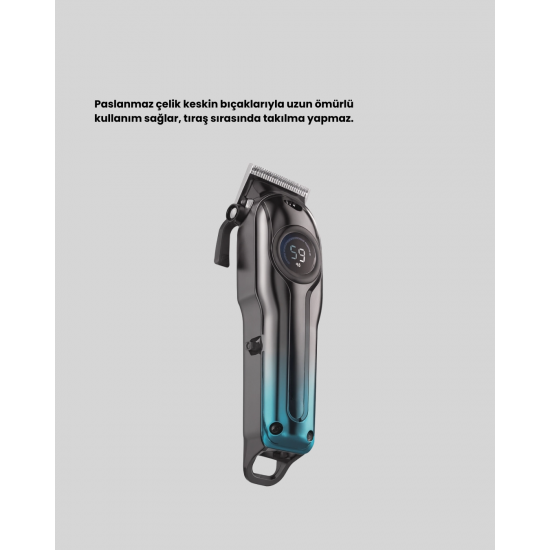Bu şarjlı saç kesme makinesi, profesyonel kaliteyi ev kullanıcılarıyla buluşturur. Güçlü 2000 mAh pili ile 3 saat şarj sonrası 210 dakika boyunca kesintisiz kullanım sağlar. USB Type-C şarj desteğiyle her yerde kolayca şarj edilebilir. Kablosuz kullanım özgürlüğü sunarken, kablolu kullanım seçeneğiyle de sürekli çalışır. LCD ekranı sayesinde kalan pil, şarj durumu ve bakım hatırlatmalarını takip edebilirsiniz. Estetik mavi-siyah tasarımı ile dikkat çeken cihaz, ergonomik gövdesi sayesinde uzun süreli kullanımlarda bile rahatlık sağlar. 6800 RPM güçlü motoru ve çelik bıçakları, en zorlu saç tiplerinde bile hızlı ve pürüzsüz kesim yapar. 4 farklı tarak başlığı ve ayarlanabilir kesim uzunluğu ile saç stilinizi istediğiniz şekilde kişiselleştirebilirsiniz.