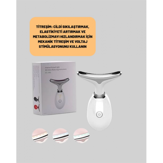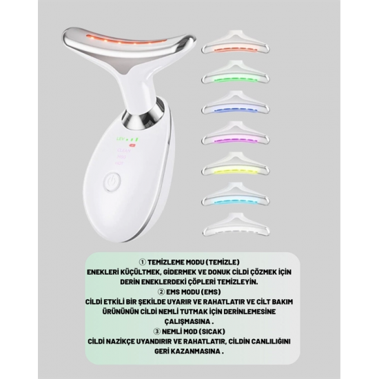 Bu çok fonksiyonlu cilt bakım cihazı, günlük cilt bakım rutininizi bir üst seviyeye taşımak için geliştirilmiştir. Temizleme, EMS (elektriksel kas stimülasyonu) ve nemlendirme modları sayesinde cildinizin ihtiyaç duyduğu her aşamayı tek bir cihazda bulabilirsiniz. TEMİZLE modu, pozitif ve negatif iyon teknolojisi ile gözeneklerin derinliklerindeki kir, yağ ve makyaj kalıntılarını etkili şekilde çıkarırken, EMS modu cildi elektrik akımıyla nazikçe uyararak kasların çalışmasını sağlar ve sıkılaşmasına yardımcı olur. SICAK modu ise sıcak kompres etkisi oluşturarak bakım ürünlerinin derinlemesine emilimini hızlandırır.Ayrıca cihaz; kırmızı, mavi ve yeşil ışık terapisi ile desteklenmiştir. Kırmızı ışık kolajen üretimini teşvik eder, cildi yeniler ve yaşlanma belirtilerini azaltır. Mavi ışık, yağ dengeleme özelliğiyle sivilce oluşumuna karşı etkilidir ve ciltteki bakterileri yok eder. Yeşil ışık, lenf drenajını destekler, şişliği azaltır ve cilt tonunu eşitler. Titreşimli masaj özelliği, kan dolaşımını hızlandırarak daha parlak ve sağlıklı bir cilt görünümüne katkıda bulunur.Dayanıklı ABS malzeme ile üretilen bu cihaz yalnızca 89x47x120 mm boyutlarındadır ve ergonomik tasarımıyla elinize rahatça oturur. 500 mAh bataryası sayesinde 2 saatte tam şarj olur ve otomatik olarak 5 dakikada kapanarak güvenli kullanım sunar. USB kablosu ile kolayca şarj edilebilir. 3.7V çıkış voltajı ve 2.5W güç ile hem hassas hem de etkili bir bakım sağlar. Cilt bakım ürünlerinin emilimini artırmak, gözenekleri arındırmak, kırışıklıkları azaltmak ve cilt sağlığınızı iyileştirmek için ihtiyacınız olan her şey bu cihazda bir araya getirildi.