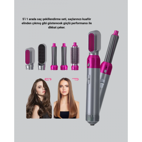Saç bakımında profesyonelliği yeniden tanımlayan 5’i 1 Arada Saç Şekillendirici Set Kuaför Düzeyinde Performans ve Ergonomik Tasarım, her stili zahmetsizce oluşturmanız için tasarlanmıştır.Düzleştirme, bukle yapma, dalga oluşturma, kurutma ve hacim verme işlemlerini tek cihazla yaparak saç bakımını hızlı ve etkili hale getirir.Negatif iyon teknolojisi, statik elektriği ortadan kaldırır ve saç tellerine doğal bir parlaklık kazandırır.Güçlü hava akımı, saçlarınızı saniyeler içinde kuruturken aynı anda şekil verir; böylece hem zamandan kazanır hem de saçın nem dengesini korur.Hafif ve ergonomik yapısı, uzun süre elde tutarken bile rahatlık sağlar.Taşınabilir kompakt boyutu, seyahatlerde kolay kullanım olanağı sunar.Yüksek ısıya dayanıklı başlıkları, her kullanımda profesyonel düzeyde performans sunar.5’i 1 Arada Saç Şekillendirici Set Kuaför Düzeyinde Performans ve Ergonomik Tasarım, her zaman pürüzsüz, hacimli ve parlak saçlara sahip olmanızı sağlar — güzelliğiniz her an sizinle!