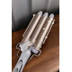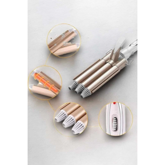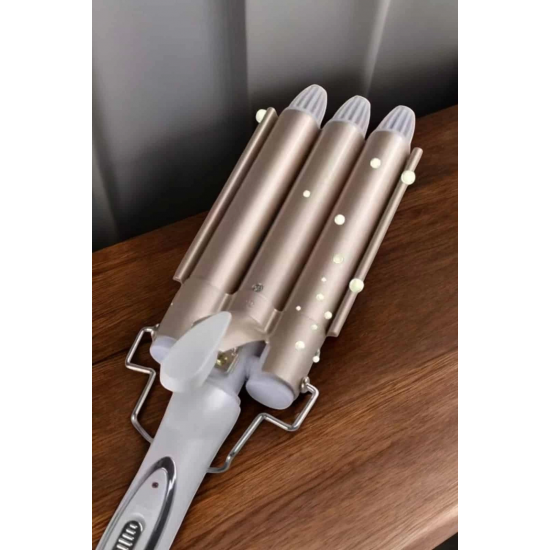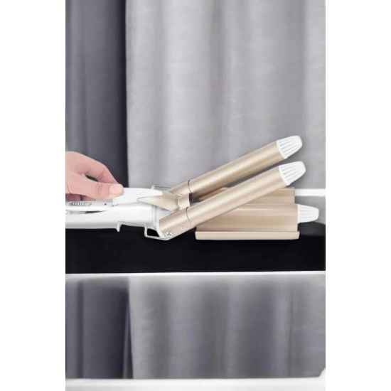 Seramik kaplama teknolojisiyle üretilen bu saç maşası, saçınıza zarar vermeden profesyonel sonuçlar elde etmenize yardımcı olur. Negatif iyon salınımı sayesinde saçtaki elektriklenmeyi azaltır ve doğal parlaklığı korur. 25 mm çapında üç namlulu tasarımı, orta ve uzun saçlarda hacimli ve kalıcı bukleler oluşturur. Hızlı ısınan PTC ısıtma sistemi, 30 saniye içinde 170°C'ye ulaşarak zamandan tasarruf etmenizi sağlar. Ayrıca 220°C'ye kadar ayarlanabilir sıcaklık kontrolü, farklı saç tipleri ve şekillendirme ihtiyaçlarına uygunluk sunar. Kaymaz tutamaç, ısı yalıtımlı ön braket ve haşlanma önleyici üst tasarımıyla güvenli ve pratik bir kullanım deneyimi sağlar. Altın rengi modern tasarımı ile şıklık ve işlevselliği bir arada sunar.