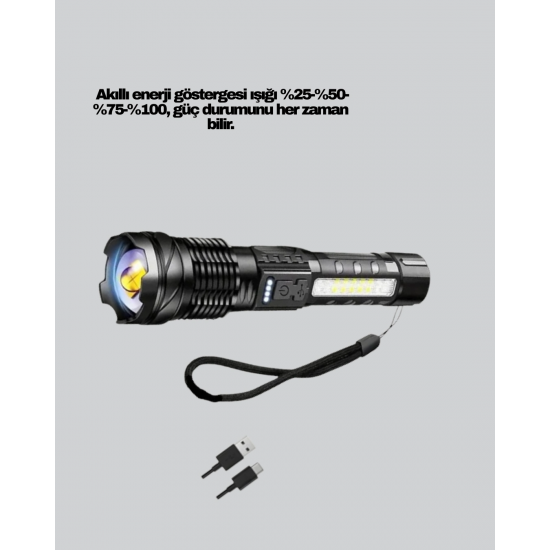 Şarjlı LED el feneri, güçlü ana LED’i ve yan COB ışığı ile çok yönlü kullanım sunar. Yan aydınlatma özelliği, tamirat ve yakın mesafe aydınlatmalarında büyük kolaylık sağlar. Yüksek lümen değeri sayesinde karanlık alanları kısa sürede aydınlatır.Ergonomik gövde tasarımı sayesinde elde rahat tutulur. Kamp, avcılık, balıkçılık ve araç içi kullanımlar için uygundur. Uzun süreli kullanım için tasarlanmış dayanıklı bir üründür.