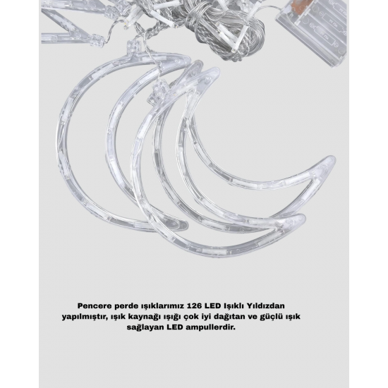 126 LED Yıldız Ay Figürlü Perde Işık, dekoratif aydınlatma ürünleri arasında hem görsel hem de işlevsel özellikleriyle öne çıkar. Yıldız ve ay teması sayesinde romantik, huzurlu ve sıcak bir atmosfer oluşturur. Özellikle akşam saatlerinde kullanıldığında ortamın enerjisini yumuşatır ve dinlendirici bir etki yaratır.İki farklı aydınlatma modu, farklı ruh hallerine uyum sağlar. Sabit ışık modu daha sakin ve romantik bir ortam sunarken, yanıp sönme modu eğlenceli ve hareketli bir dekorasyon sağlar. LED ışıklar güçlü bir aydınlatma sunmasına rağmen göz yormaz ve uzun süreli kullanıma uygundur.Pilli çalışma sistemi, ürünün en büyük avantajlarından biridir. Elektrik prizine ihtiyaç duymadan çalıştığı için her alanda rahatlıkla kullanılabilir. Balkon, bahçe, teras, veranda gibi dış mekanlarda olduğu kadar salon, yatak odası ve çocuk odasında da güvenle tercih edilebilir.Dayanıklı PVC kaplı kablosu sayesinde uzun ömürlüdür ve güvenli kullanım sunar. Isınma yapmayan LED yapısı sayesinde yangın riski oluşturmaz. Bu özellikleri ile hem ev kullanımı hem de organizasyon dekorasyonları için idealdir.Ramazan, düğün, doğum günü, parti ve özel gün süslemelerinde estetik bir tamamlayıcıdır. Aynı zamanda sevdiklerinize hediye olarak da tercih edilebilir.