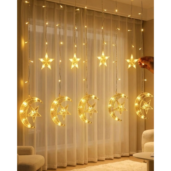 Mey İthalat® Hilal Yıldız Perde LED Işık 2 Modlu Sıcak Beyaz Dekoratif Aydınlatma