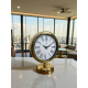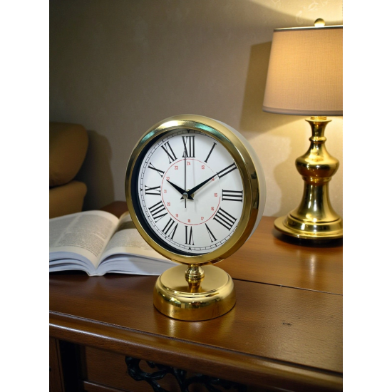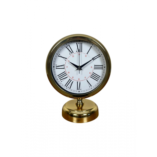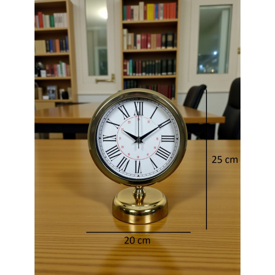Klasik dekorasyonun vazgeçilmezi olan Roma rakamları, gold kasanın ışıltısı ve sade kadran tasarımıyla birleşerek bu masa saatini hem şık bir aksesuar hem de günlük kullanımda pratik bir ürün haline getiriyor. 25 x 20 cm ölçüsü sayesinde masada yer kaplamadan dikkat çeker; çalışma masası, salon konsolu, raf veya komodin üzerinde bulunduğu ortama anında zarif ve prestijli bir hava katar.