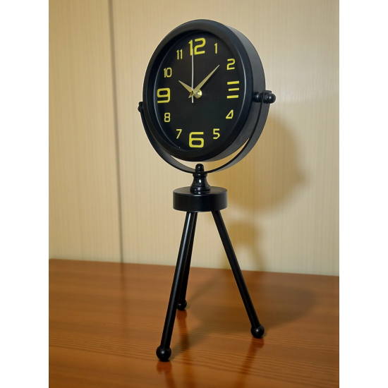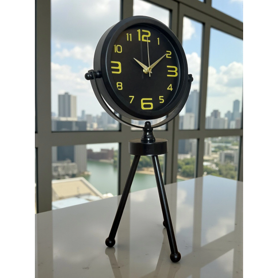 45 x 25 cm ölçülerindeki bu modern siyah üç ayaklı masa saati, minimal tasarımı ve güçlü duruşuyla her ortama şıklık katar. Gerçek cam korumalı kadranı sayesinde net görüntü ve uzun ömürlü kullanım sağlar. Tamamen metal gövdesi ve tripod ayak yapısıyla sağlam, dekoratif ve premium bir görünüm sunar. Sessiz akar saniye mekanizmasıyla ev, ofis ve çalışma alanlarında rahatsızlık vermeden kullanılabilir.
