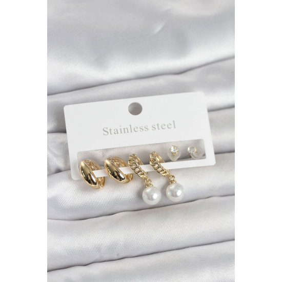 Mey İthalat® 316L Çelik Gold Renk inci Halka Detaylı Kadın Küpe Seti