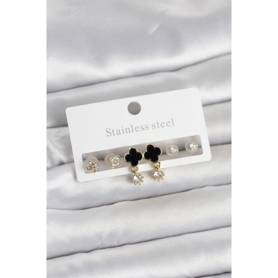Mey İthalat® 316L Çelik Gold Renk Yonca Detaylı Kadın Küpe Seti