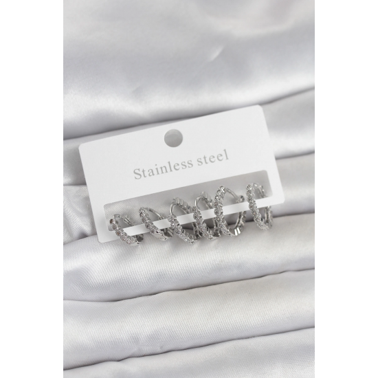Mey İthalat® 316L Çelik Gümüş Renk Zirkon Taşlı Halka Model Kadın Küpe Seti