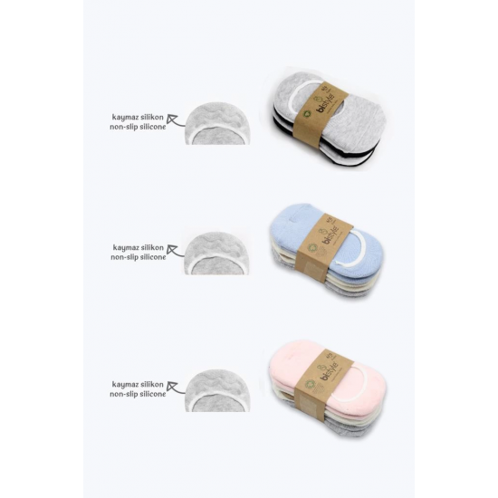 Mey İthalat® 6'Lı Silikonlu Babet Penye Çorap 30101 Mavi Ekru Gri