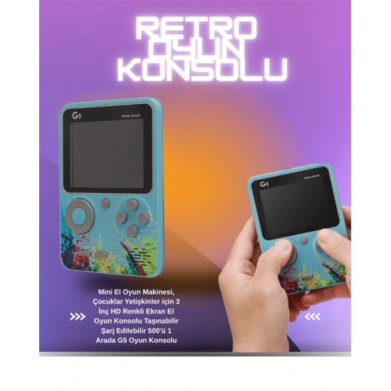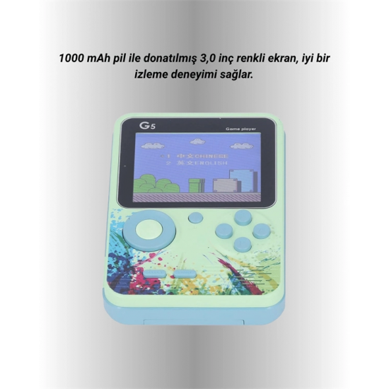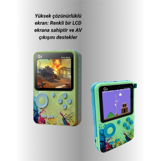 Gelişmiş renkli 3 inç LCD ekranı, oyun deneyimini daha net ve canlı hale getirirken, ergonomik tuş yerleşimi sayesinde uzun süreli kullanımda konfor sağlar. Oyunlar doğrudan cihazın hafızasına yüklü olarak geldiği için ekstra indirme, kurulum veya internet bağlantısına gerek yoktur.USB kablo ile şarj edilen dahili bataryası, tek şarjla uzun süreli kullanım sağlar. Elektrik bağımlılığı olmadan özgürce oyun oynayabilirsiniz. Dayanıklı plastik kasası, düşmelere ve çizilmelere karşı dirençlidir. G5 Game Box, hem geçmişin oyunlarını yaşatmak isteyen yetişkinler hem de keşfetmeye hevesli çocuklar için eğlenceli, kullanışlı ve duygusal değeri yüksek bir cihazdır.