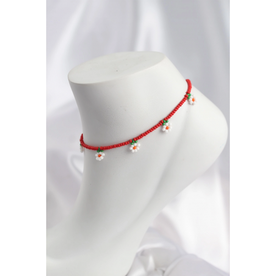 Mey İthalat® Kırmızı Renk Boncuklu Papatya Motifli Halhal