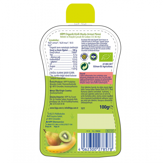 Mey İthalat® Organik Kivili Muzlu Armut Püresi 100 Gr