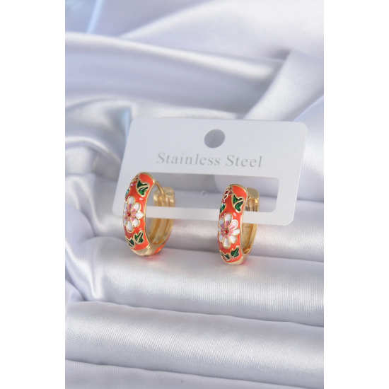 Mey İthalat® Pirinç Gold Renk Çiçek İşleme Turuncu Kadın Küpe