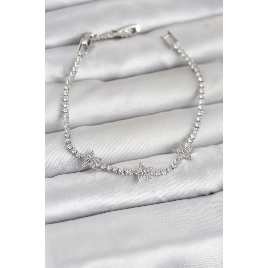 Mey İthalat® Pirinç Gümüş Renk Minimal Yıldız Model Zirkon Taşlı Su Yolu Kadın Bileklik
