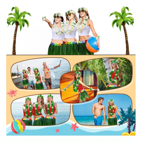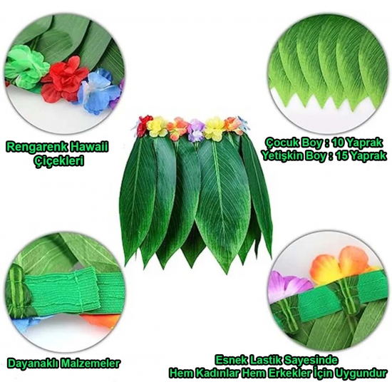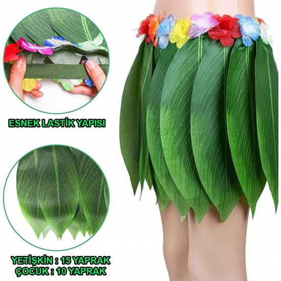Doğal görünümlü yapay yapraklardan özenle hazırlanan bu etek, tropikal temalı etkinlikleriniz, partileriniz veya özel günleriniz için mükemmel bir seçim. İster Hawai temalı bir doğum günü kutlaması, ister yaz partisi, ister kostüm balosu olsun, bu etek ile tüm dikkatleri üzerinize çekeceksiniz.