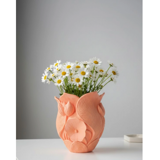 Bu 3D turuncu çiçekli vazo, sanatsal yüzey dokusu ve modern tasarımı ile ev dekorasyonunda şık bir tamamlayıcıdır. Çiçeksiz ya da çiçekli kullanıma uygundur.Minimal ama etkileyici bir dekor arayanlar için özel olarak tasarlanmıştır.