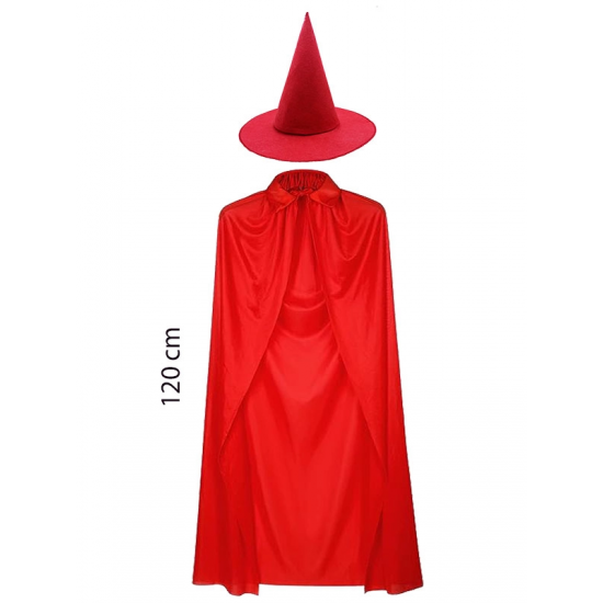 Mey İthalat® Yetişkin Boy 120 cm Kırmızı Yakalı Pelerin ve Kırmızı Cadı Şapkası