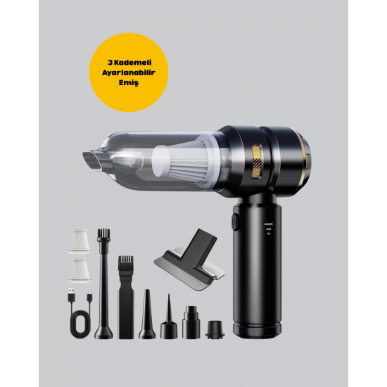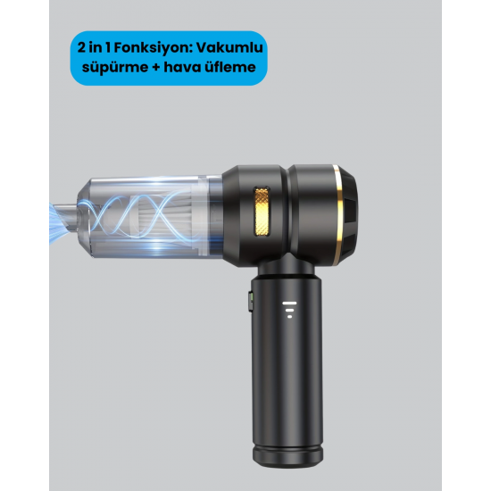 Şarjlı, kablosuz ve çok fonksiyonlu yapısıyla dikkat çeken bu araç içi süpürge, günlük temizlik rutinlerinizi daha kolay ve hızlı hale getiriyor. 2 in 1 fonksiyonuyla hem güçlü vakumlama hem de hava üfleme özelliklerini bir arada sunuyor. 15.000 PA emiş gücü, en küçük toz parçacıklarını bile etkili şekilde temizler. Üç farklı kademeli emiş seçeneği sayesinde kullanım alanınıza uygun performans elde edebilirsiniz. HEPA filtre sistemiyle toz ve partikülleri yüksek verimlilikle yakalarken yıkanabilir özelliğiyle uzun süreli ve hijyenik kullanım sunar. Geniş toz haznesi kolayca boşaltılabilir ve temizlenebilir. Kompakt ve hafif tasarımıyla hem taşınabilir hem de ergonomiktir. Uzun süreli kullanımlarda bile rahatlık sağlayan tutma kolu, temizlik işlerinizi keyifli hale getirir. Sessiz motor teknolojisi sayesinde gürültüsüz çalışır ve her ortamda kullanılabilir. Zengin aksesuar seti içerisinde dar ağızlı başlık, fırçalı başlık ve üfleme aparatı gibi seçenekler bulunur. Bu sayede aracınızın koltuk araları, döşemeleri, evinizdeki küçük alanlar, mobilya köşeleri ve daha pek çok alanı pratik bir şekilde temizleyebilirsiniz. Çok yönlü kullanımıyla hayatınızı kolaylaştıran bu süpürge, temizlik deneyiminizi profesyonel seviyeye taşır.