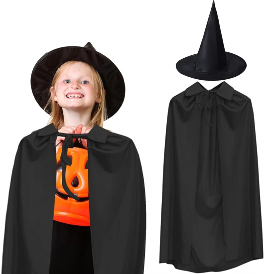 Mey İthalat® 90 cm Siyah Yakalı Pelerin ve Siyah Cadı Şapkası Kostüm Seti