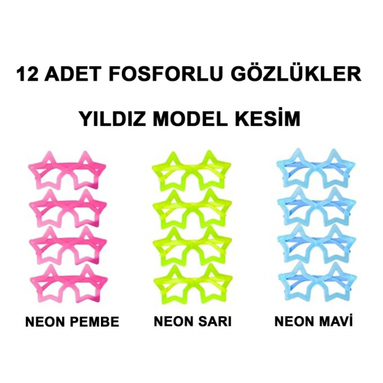 Mey İthalat® Fosforlu Yıldız Model Glow Parti Gözlüğü Karanlıkta Yanan Gözlükler 12 Adet