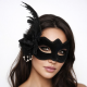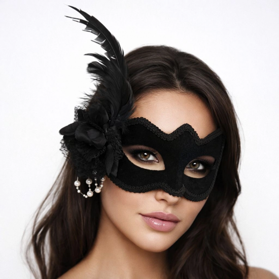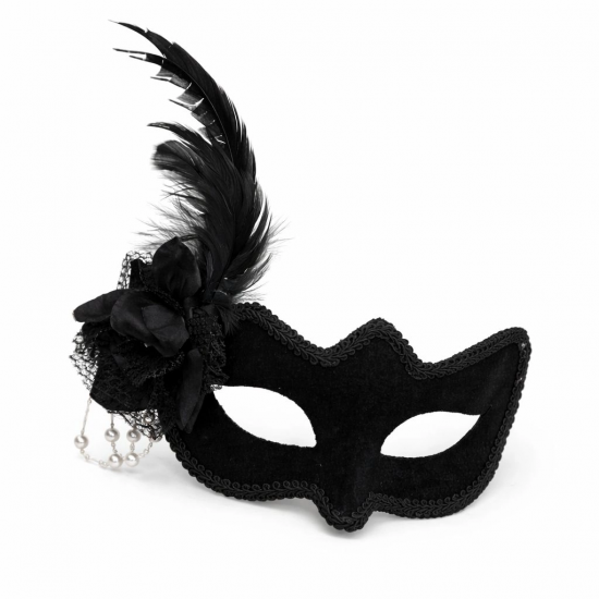 Mey İthalat® Beyaz İnci Detaylı Siyah Süet Venedik Kadın Maskesi Tüylü Güllü