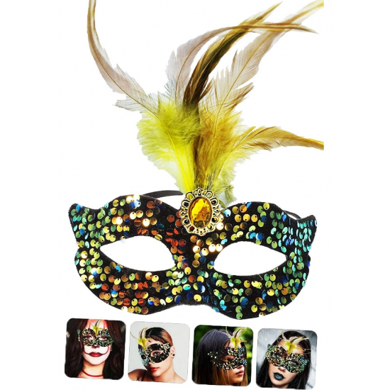 • Sarı tüyler ve sarı taşlar maskeye lüks ve göz alıcı bir görünüm kazandırır.