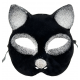 - Siyah süet ve gümüş simlerle süslenmiş sevimli bir kedi maskesi tasarımı.