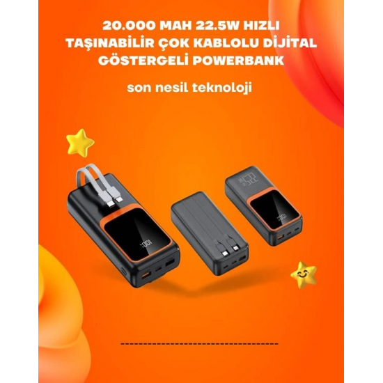Mey İthalat® Powerbank 20000 mAh | 22.5W Hızlı Şarj, Dahili Kablolu, LCD Ekranlı Şarj Cihazı