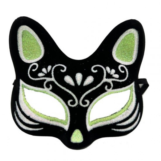 Siyah Renk Süet Kaplama Üzeri Gümüş Yeşil Simli Kedi Maskesi 17x14 cm