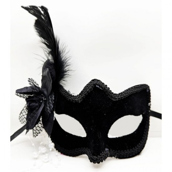 Siyah Süet Yandan Tüylü İncili Parti Maskesi
