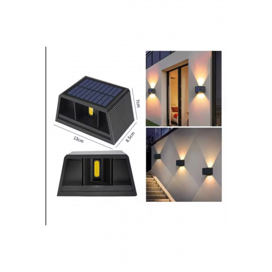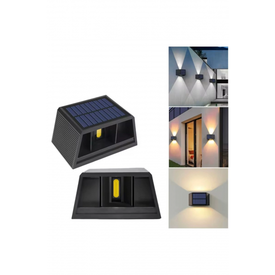 Bu şık ve modern güneş enerjili duvar lambası ile dış mekanlarınızı aydınlatın! Kendinden şarj edilebilir güneş paneli sayesinde elektrik bağlantısına ihtiyaç duymaz, gün boyunca güneş ışığını depolayarak geceleri otomatik olarak yanar.; Çift yönlü aydınlatma tasarımı sayesinde hem yukarı hem de aşağı doğru hoş bir ışık yayarak duvarlarınızda estetik bir ambiyans yaratır.; Suya dayanıklı yapısı ile her türlü hava koşuluna uygun olup, bahçelerinizde, teraslarınızda, balkonlarınızda, kapı girişlerinizde veya merdiven kenarlarında güvenle kullanabilirsiniz.; Kolay kurulumu sayesinde dakikalar içinde monte edilebilir.; Enerji tasarrufu sağlayan ve çevre dostu bu ürünle dış mekanlarınıza modern bir dokunuş katın ve gecelerinizi aydınlatın! Ürün Özellikleri: * Boyutlar: 13 cm (genişlik) x 8.5 cm (derinlik) x 7 cm (yükseklik) * Enerji Kaynağı: Güneş enerjili * Aydınlatma Yönü: Çift yönlü (yukarı ve aşağı) * Malzeme: Dayanıklı ve suya dayanıklı malzeme * Kurulum: Kolay ve hızlı kurulum Kullanım Alanları: * Bahçe Duvarları * Teraslar * Balkonlar * Kapı Girişleri * Merdiven Kenarları * Garaj Girişleri ve daha fazlası!