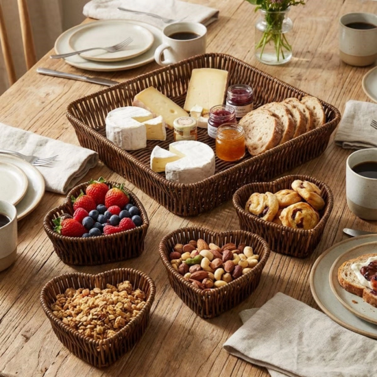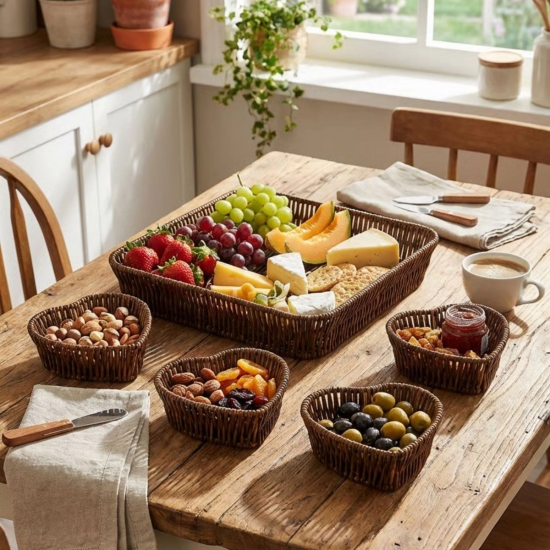 5 Parça, 4 Kalp Formlu Plastik Rattan Sunum ve Kahvaltı Seti – Bölmeli Çerezlik ve Meyvelik, Dekoratif Doğal Hasır Görünümlü Tepsi ve Sunum Tabakları
