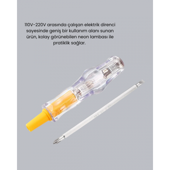 Bu neon ışıklı elektrik kontrol kalemi, 110V–220V aralığında çalışma özelliği sayesinde çok yönlü elektrik kontrollerinde kullanım için uygundur. Elektrik hattında akım olup olmadığını hızlı şekilde anlamanızı sağlayan neon lamba göstergesi, basit tamirat işlemlerinde güvenliği artırır. Neon ışığının parlak ve net görünümü, düşük ışık koşullarında bile rahat bir kullanım sunar. Ev kullanıcıları, ustalar, elektrikçiler ve hobi amaçlı çalışanlar için ideal bir araçtır.Ürün, nikel kaplamalı güçlü gövdesi ile uzun ömürlü kullanım sağlar. Nikel kaplama, paslanmaya karşı yüksek direnç sunarak zorlu çevresel koşullarda bile ürünün dayanıklılığını korur. Bu sayede hem iç mekan hem dış mekan elektrik işlemlerinde güvenle kullanılabilir. Ürünün metal uç yapısı hassas bir şekilde işlenmiştir ve vida yuvalarına tam oturarak çalışma sırasında kaymayı engeller.Hassas uç tasarımı sayesinde priz, elektrik panosu, kablo bağlantıları, şalter kutuları gibi çeşitli alanlarda doğru kontrol yapılabilir. Kullanıcıya kolaylık sağlayan ergonomik tutuş yapısı, uzun süreli kullanımda bile rahatlık sunar. Her seviyeden kullanıcı için güvenli ve pratik kullanım imkânı sağlar.Kompakt boyutu ve hafif yapısı, ürünün cebe veya alet çantasına kolayca sığmasını sağlar. Bu özellik, test kalemini her an elinizin altında bulundurmanıza olanak tanır. Elektrik kaçaklarını tespit etme, akım kontrolleri ve temel elektrik tamiratlarında önemli bir yardımcıdır.Güçlü, güvenilir ve dayanıklı yapısıyla bu neon lambalı elektrik test kalemi, hem profesyoneller hem de ev kullanıcıları için günlük elektrik işlerinde vazgeçilmez bir araçtır.