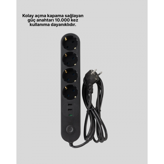 USB ve Type-C destekli 4’lü çoklu priz, modern elektronik cihazlar için güvenli ve pratik bir enerji çözümüdür. Akım koruma özelliği sayesinde cihazlarınızı ani elektrik dalgalanmalarına karşı korur. 4 priz çıkışı, aynı anda birden fazla cihaz kullanımına olanak tanır.Akıllı akım dengeleme sistemi, her cihaza ihtiyacı kadar enerji sağlar. Termal ve kısa devre koruması, aşırı ısınma ve elektriksel risklere karşı üst düzey güvenlik sunar. Yüksek ısıya dayanıklı PC-ABC kasa, uzun ömürlü kullanım sağlar.20.000 kez tak-çıkar ve 10.000 aç-kapa testlerinden geçmiş güç anahtarı, ürünün dayanıklılığını kanıtlar. 2 metre kablo uzunluğu, farklı alanlarda rahat kullanım sunar. Led göstergeli anahtar, kullanım durumunu anında görmenizi sağlar.Bilgisayar, televizyon, modem, yazıcı, kamera ve benzeri tüm elektronik cihazlarla uyumlu olan bu çoklu priz, ev ve ofisler için ideal bir tercihtir.