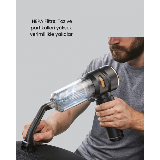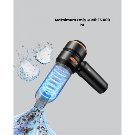 Temizlik işlerinizi pratik, hızlı ve etkili hale getiren bu kablosuz araç içi süpürge, fonksiyonel özellikleriyle hayatınızı kolaylaştırıyor. 2 in 1 fonksiyonlu yapısı sayesinde hem vakumlama hem de üfleme özelliğini bir arada sunuyor. 15.000 PA güçlü emiş kapasitesiyle en küçük tozlardan inatçı kir ve kırıntılara kadar her şeyi kolayca temizler. Üç kademeli emiş seçeneğiyle kullanım alanına göre ayarlama yapabilirsiniz. HEPA filtre sistemi tozları yüksek verimlilikle hapsederek temiz ve sağlıklı bir ortam oluşturur. Yıkanabilir filtre özelliği sayesinde hijyenik kullanım ve uzun ömürlü performans elde edersiniz. Geniş toz haznesi kolayca boşaltılabilir ve temizlenebilir. Kompakt ve hafif yapısı, ergonomik tutma kolu ile birleşerek uzun süreli kullanımda bile konfor sağlar. Sessiz çalışan motoru, her ortamda rahatlıkla kullanım imkânı tanır. Farklı başlık seçenekleri ile dar alanlardan hassas yüzeylere kadar her köşeyi derinlemesine temizlemeniz mümkün olur. Araç içi detaylı temizlik için ideal olan bu süpürge, aynı zamanda evinizde küçük alanlarda da çok yönlü kullanım sağlar. Fonksiyonel özellikleri ve güçlü performansıyla her an yanınızda olacak pratik bir temizlik yardımcısıdır.